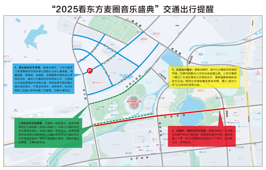 3。 公交出行提醒:演唱会期间,扬州公交集团放置接驳专线,便利市平易近群众从市区往返体育公园,交管部分泛博不雅众乘坐公交绿色出行,避免道拥堵耽搁出行打算。相关公交代驳事宜具体详情,请以“扬州公交”号对外发布为准。