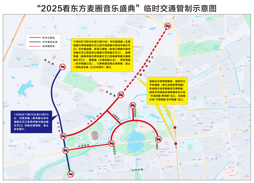 “2025看东方麦圈音乐盛典”将于12月6日19时正在扬州体育公园体育场举行,为确保演唱会期间道交通平安通顺,按照《中华人平易近国道交通平安法》及《中华人平易近国道交通平安法实施条例》的相关,决定对相关道实施姑且交通办法,现就相关事宜布告如下!